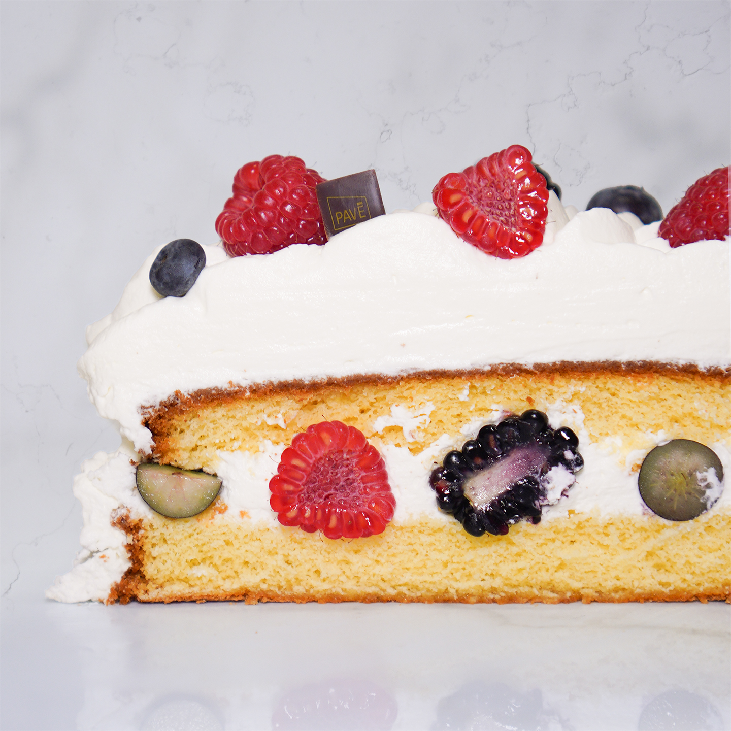 Sponge cake, pastry cream, whipped cream, and fresh fruit. Filling: Mixed berries or wild strawberries.