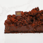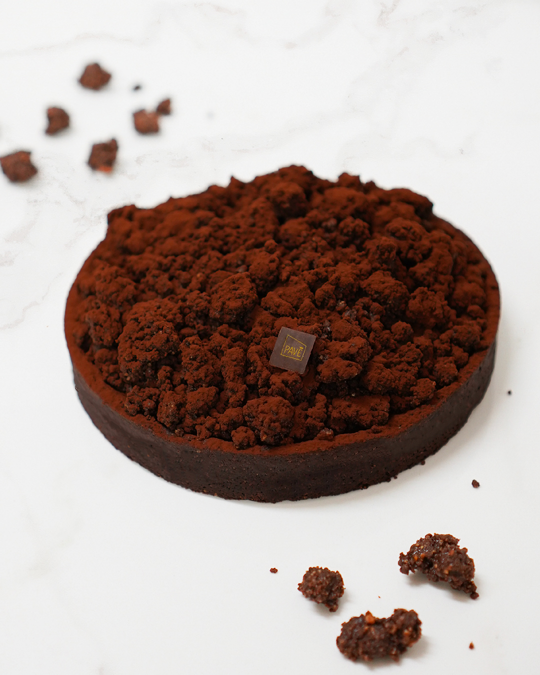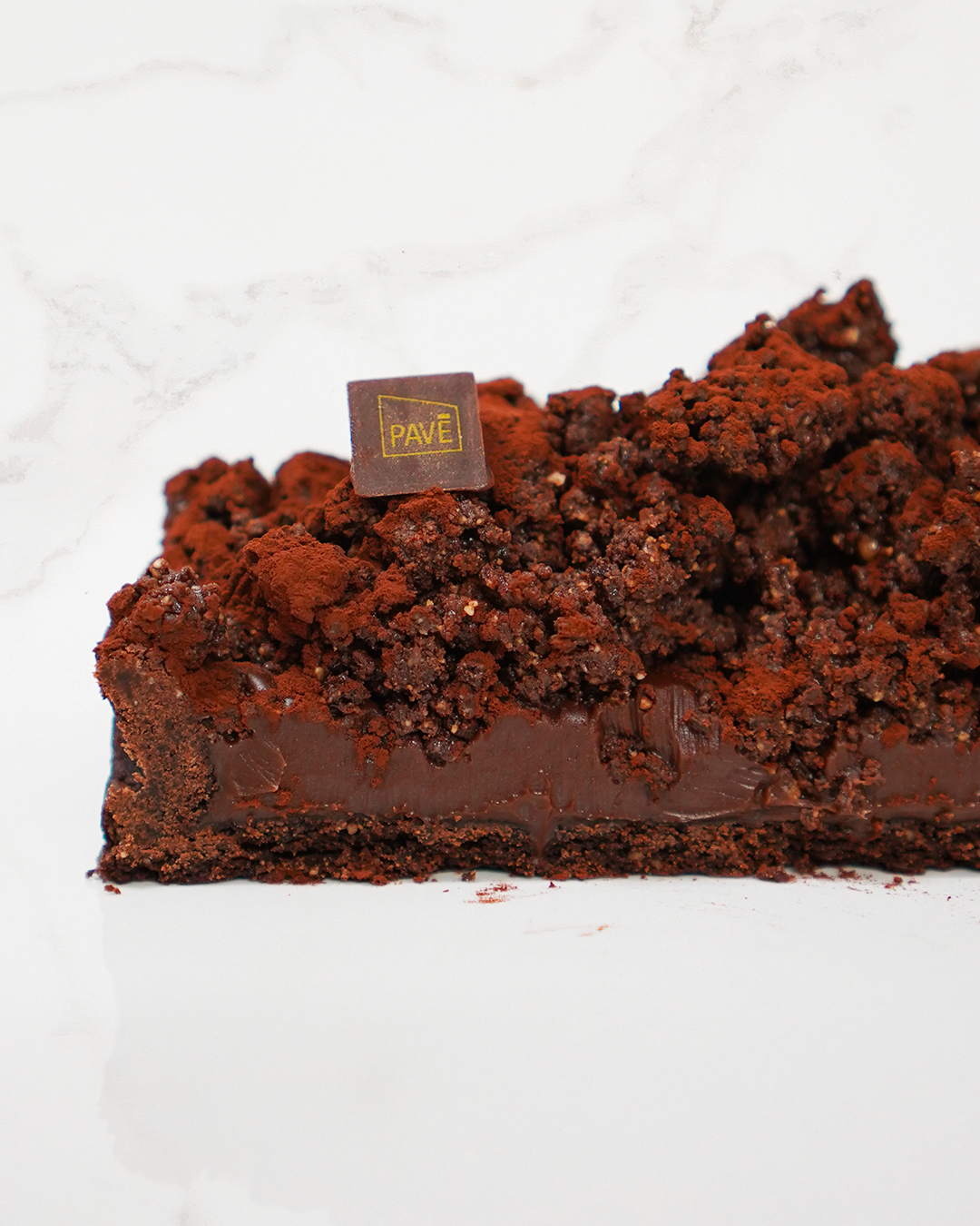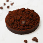 La nostra crostata al cacao con ganache al cioccolato fondente al 61%, coperta di streusel al cacao.