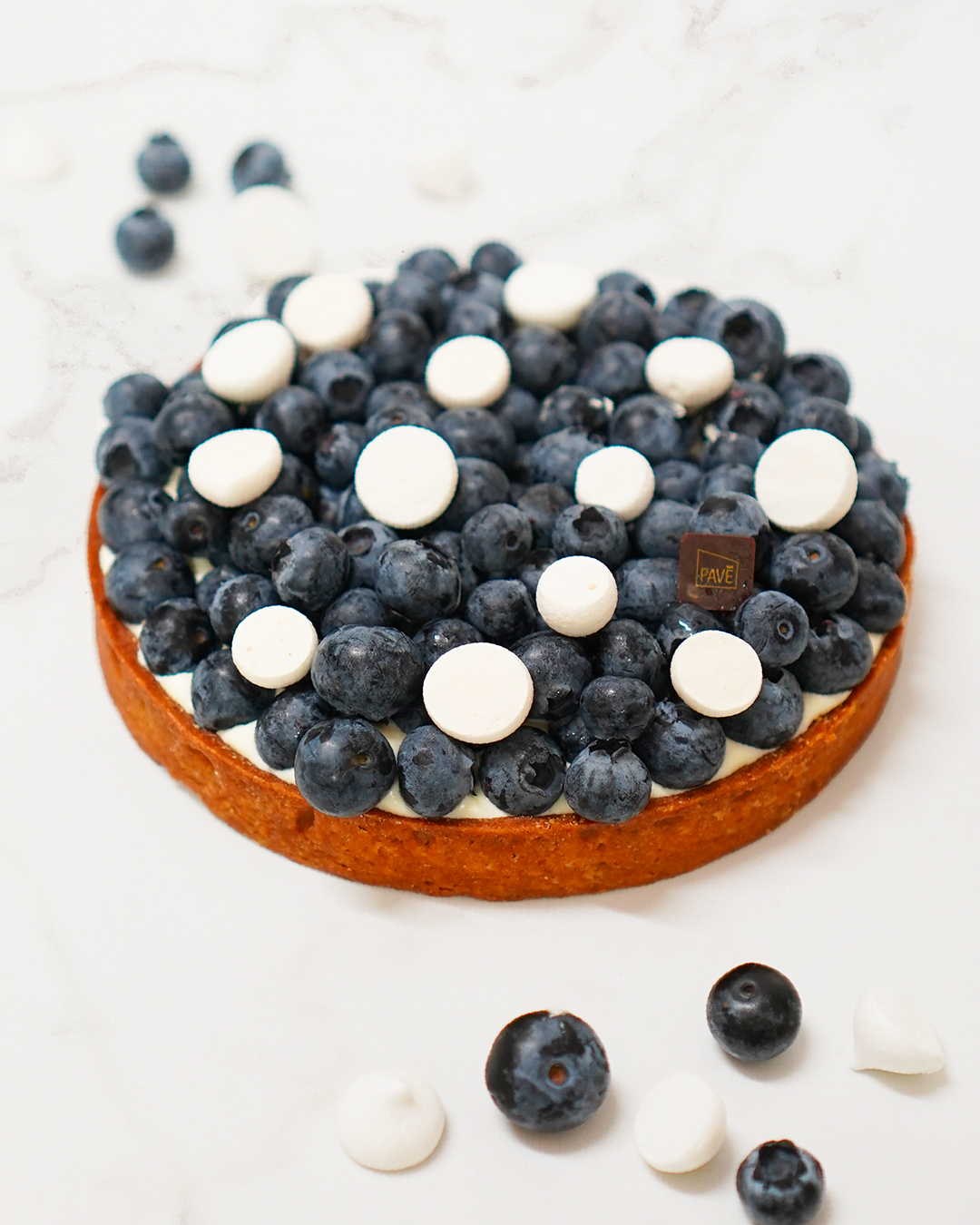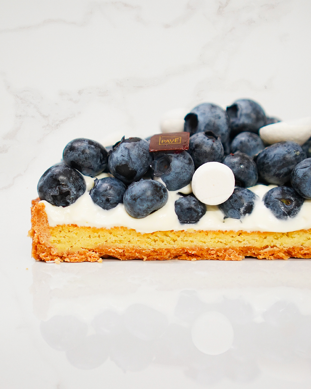 Frolla [farina di GRANO tenero tipo 0, farina di MANDORLE, burro (LATTE), UOVA, zucchero, sale], frangipane [farina di MANDORLE, burro (LATTE), UOVA, zucchero, amido di mais], crema pasticciera [LATTE, panna (LATTE), tuorlo d’UOVO, zucchero, amido di riso, vaniglia del Madagascar], mirtilli, meringhe alla francese (albume d’UOVO, zucchero semolato)