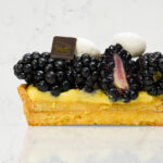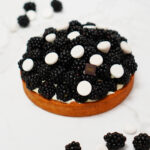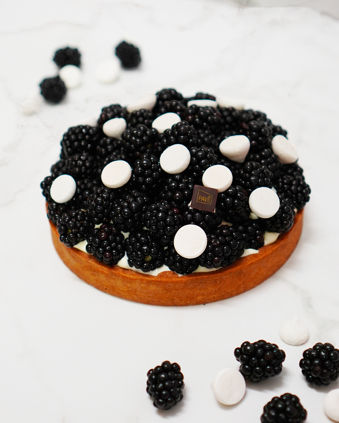 Frolla [farina di GRANO tenero tipo 0, farina di MANDORLE, burro (LATTE), UOVA, zucchero, sale], frangipane [farina di MANDORLE, burro (LATTE), UOVA, zucchero, amido di mais], crema pasticciera [LATTE, panna (LATTE), tuorlo d’UOVO, zucchero, amido di riso, vaniglia del Madagascar], more, meringhe alla francese (albume d’UOVO, zucchero semolato)