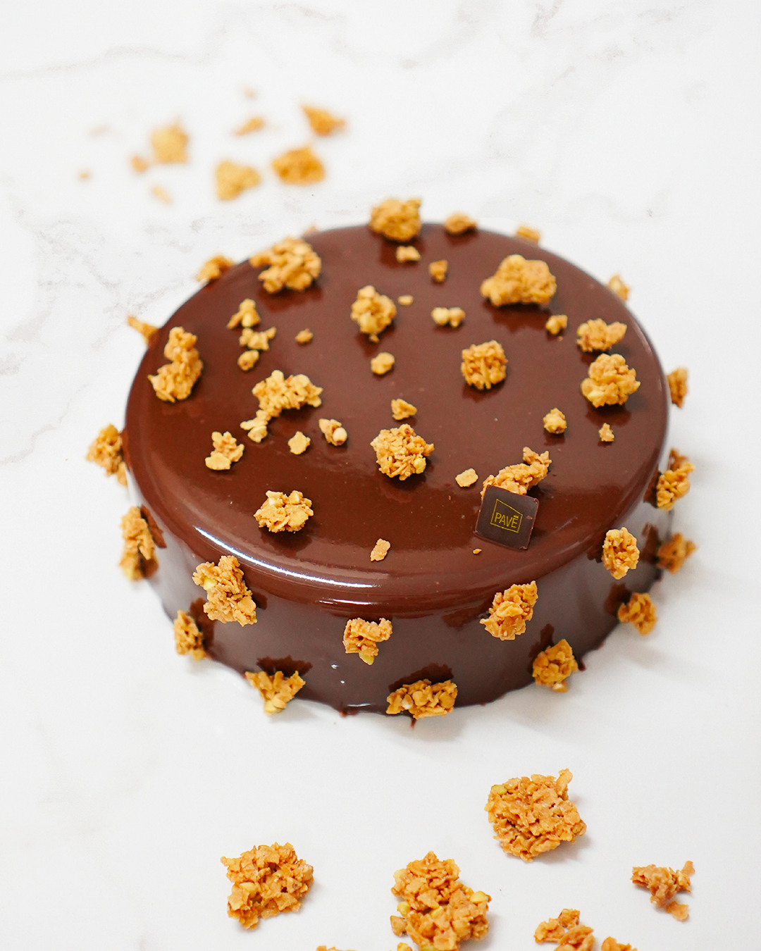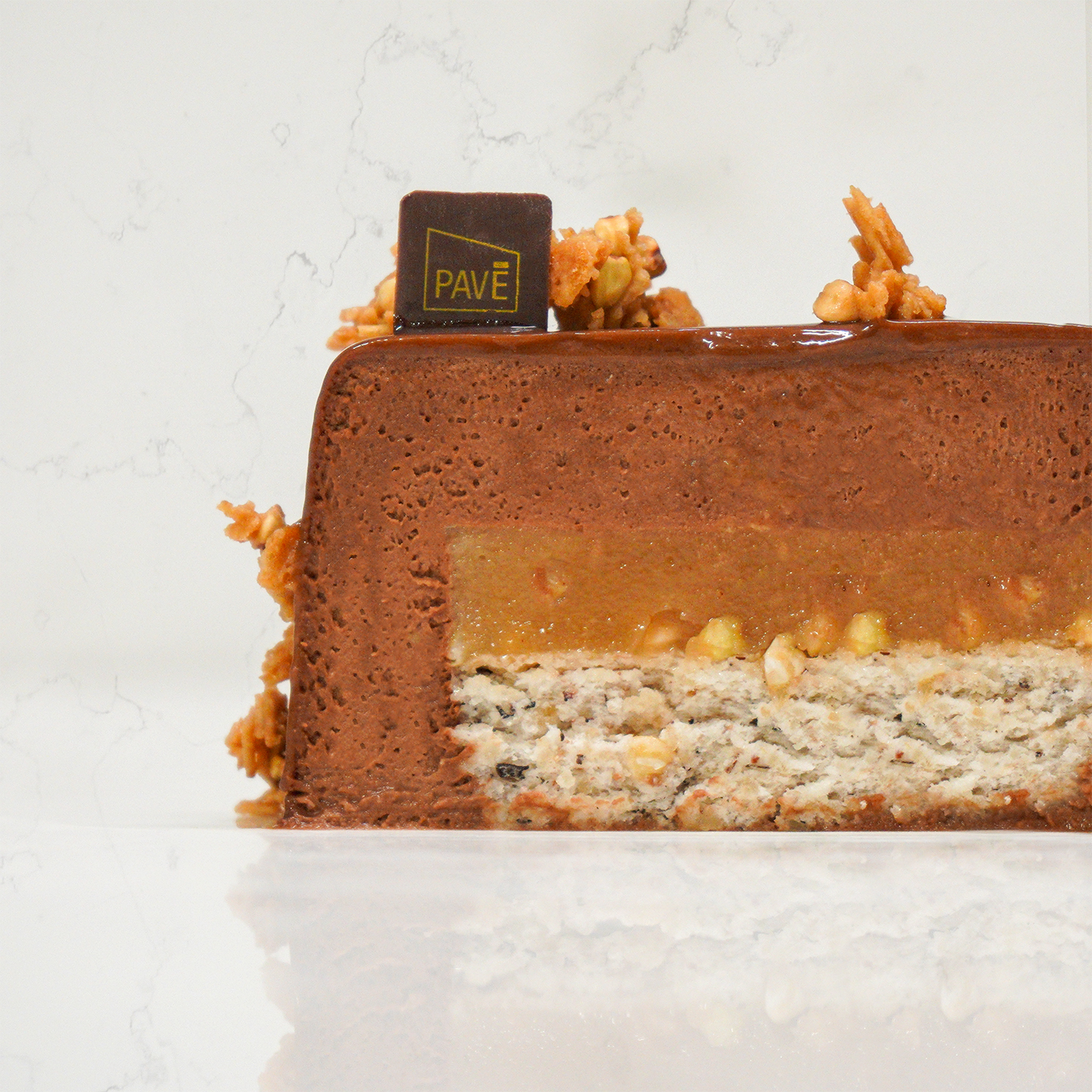 La nostra Pere e cioccolato: un biscotto morbido al grano saraceno con inserto di polpa di pere, mousse al cioccolato fondente e un croccante al cioccolato biondo ed eclat d'or a decorare.