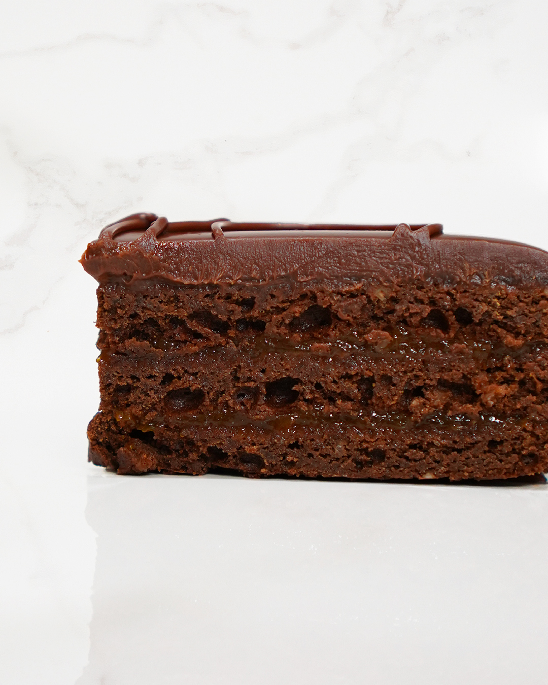 La nostra Sacher con pan di Spagna al cacao, sciroppo alla vaniglia, confettura di albicocche al 160% di frutta e ganache al cioccolato fondente al 61%.