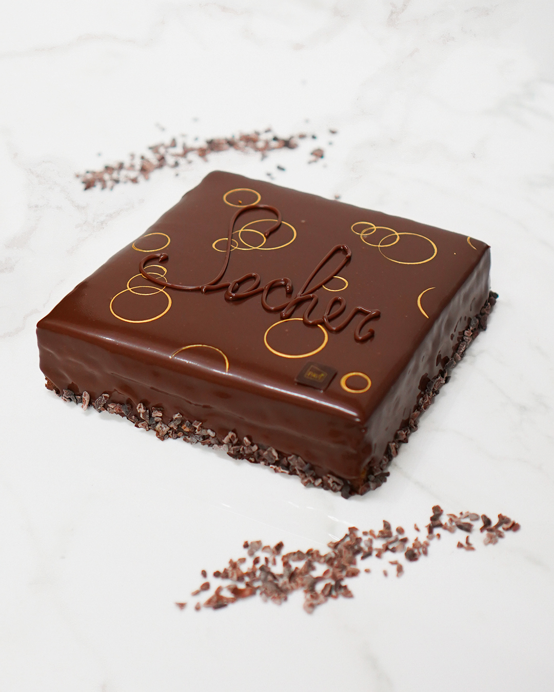 Biscuit [pasta di MANDORLE (farina di MANDORLE, zucchero semolato, albume d’UOVO, pasta di arancio), tuorlo d’UOVO, zucchero semolato, burro (LATTE), cioccolato fondente 61% (fave di cacao, zucchero, burro di cacao, emulsionante: lecitina di girasole, estratto naturale di vaniglia), farina di GRANO tenero tipo 0, UOVA, cacao in polvere], confettura di albicocche al 160% (albicocca, zucchero, sciroppo di glucosio-fruttosio), ganache al cioccolato [panna (LATTE), cioccolato fondente 61% (fave di cacao, zucchero, burro di cacao, emulsionante: lecitina di girasole, estratto naturale di vaniglia), glucosio, burro (LATTE)], decorazione (fave di cacao, colorante oro)