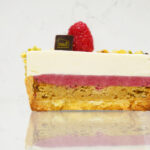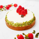 La nostra crostata con frangipane al pistacchio crudo, cremoso di lamponi e mousse al cioccolato bianco con infusione alla fava Tonka.