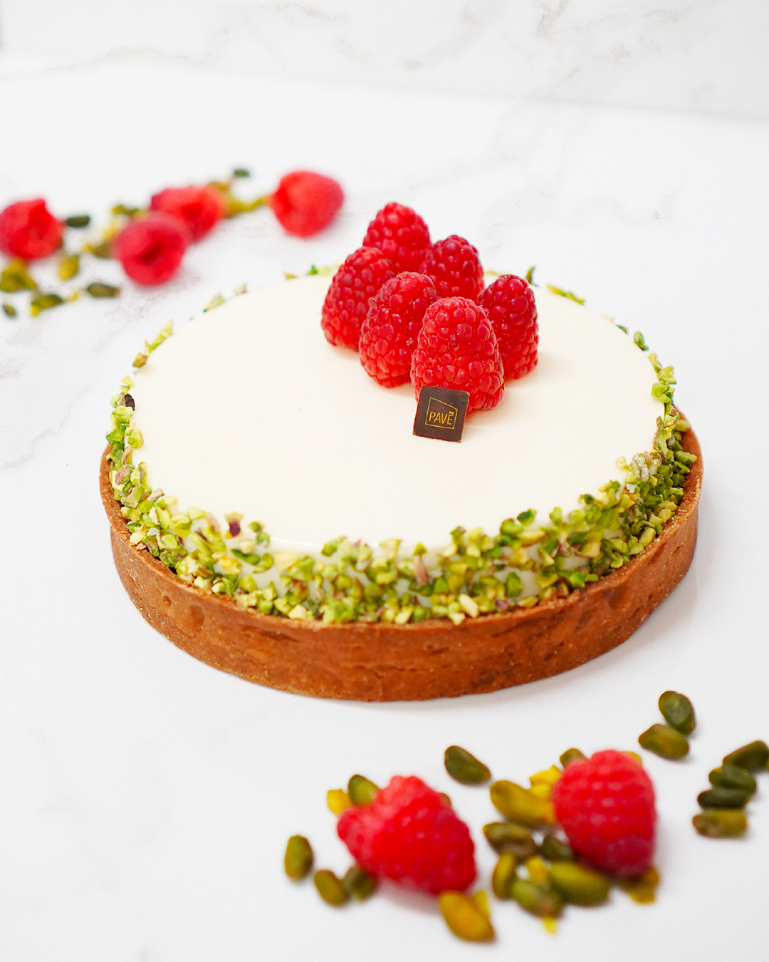 Frolla [farina di GRANO tenero 0, farina di MANDORLE, burro (LATTE), UOVA, zucchero, sale], frangipane [farina di MANDORLE, pasta di PISTACCHIO, burro (LATTE), UOVA, amido di mais, zucchero], cremoso (purea di lampone, zucchero, acqua, olio di cocco, inulina, pectina, fibra di agrumi], lamponi freschi, mousse [cioccolato bianco (zucchero, burro di cacao, LATTE intero in polvere, LATTE scremato in polvere, amulsionante (lecitina di SOIA), aroma naturale di vaniglia), LATTE, panna (LATTE), acqua, gelatina di origine suina, fava Tonka], PISTACCHIO crudo, glassa (gelatina di origine vegetale, acqua)